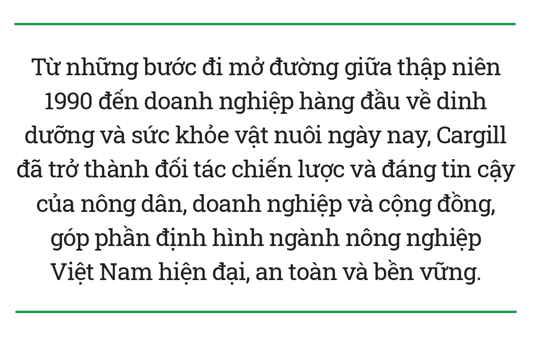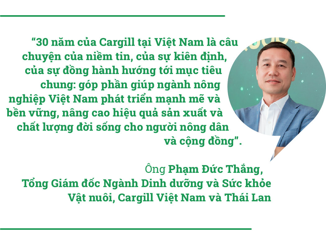 30 năm đồng hành cùng Việt Nam là hành trình của niềm tin, kiên định, đổi mới và sẻ chia của Cargill Việt Nam. Với tầm nhìn toàn cầu, các giải pháp tối ưu hóa cho nhu cầu địa phương, nền tảng vững chắc và nhiệt huyết tràn đầy, Cargill tiếp tục sứ mệnh “nuôi dưỡng thế giới theo một phương thức an toàn, có trách nhiệm và bền vững”, kết nối người nông dân Việt Nam với hệ sinh thái thực phẩm thế giới, cùng vững bước tiến vào giai đoạn phát triển mới, bền vững hơn, thịnh vượng hơn.