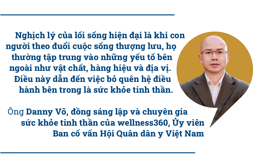 Ông Danny Võ, đồng sáng lập và chuyên gia sức khỏe tinh thần của wellness360, Ủy viên Ban cố vấn Hội Quân dân y Việt Nam, chỉ ra nghịch lý của lối sống hiện đại là khi con người theo đuổi cuộc sống thượng lưu, họ thường tập trung vào những yếu tố bên ngoài như vật chất, hàng hiệu và địa vị. Điều này dẫn đến việc bỏ quên hệ điều hành bên trong là sức khỏe tinh thần. Ông ví von sức khỏe tinh thần giống như nền móng của ngôi nhà, dù không nhìn thấy, nhưng quyết định sự vững chắc của toàn bộ cấu trúc.