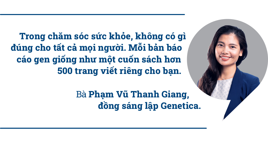 “Trong chăm sóc sức khỏe, không có gì đúng cho tất cả mọi người. Mỗi bản báo cáo gen giống như một cuốn sách hơn 500 trang viết riêng cho bạn”, bà Phạm Vũ Thanh Giang, đồng sáng lập Genetica, nói. Bà cho biết gen chỉ chiếm khoảng 35% kết quả sức khỏe, còn lại 65% phụ thuộc vào môi trường và lối sống, chính là sự tương tác giữa gen và ngoại cảnh. Báo cáo gen có thể giúp mỗi người hiểu rõ cơ chế sản sinh hormone hạnh phúc hay hormone căng thẳng, từ đó điều chỉnh thói quen sống.