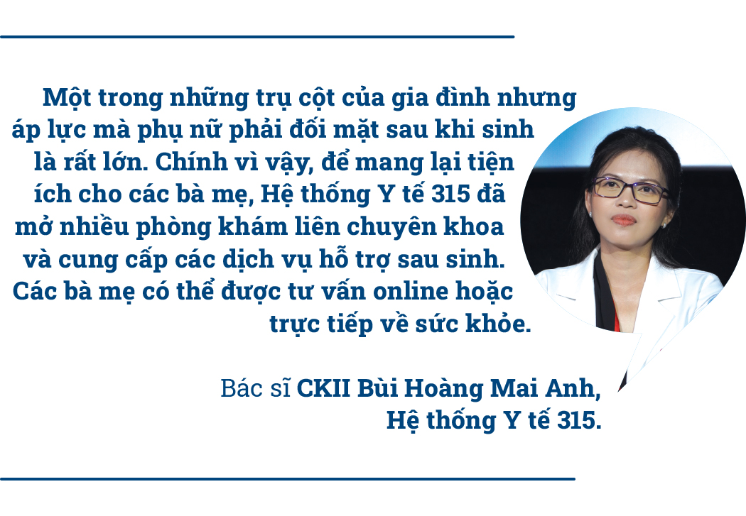 Về vấn đề này, bác sĩ CKII Bùi Hoàng Mai Anh, Hệ thống Y tế 315, cho biết, là một trong những trụ cột của gia đình nhưng áp lực mà phụ nữ phải đối mặt sau khi sinh là rất lớn. Chính vì vậy, để mang lại tiện ích cho các bà mẹ, Hệ thống Y tế 315 đã mở nhiều phòng khám liên chuyên khoa và cung cấp các dịch vụ hỗ trợ sau sinh. Các bà mẹ có thể được tư vấn online hoặc trực tiếp về sức khỏe.