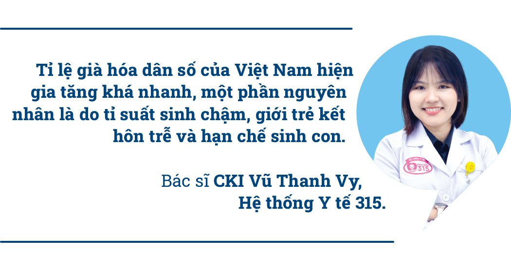 Tại Việt Nam, bác sĩ CKI Vũ Thanh Vy, Hệ thống Y tế 315, cho biết tỉ lệ già hóa dân số của Việt Nam hiện gia tăng khá nhanh, một phần nguyên nhân là do tỉ suất sinh chậm, giới trẻ kết hôn trễ và hạn chế sinh con.