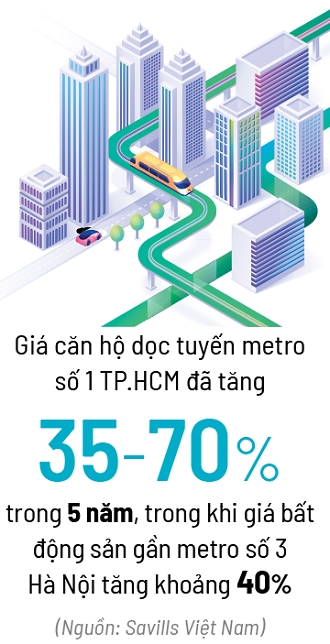 Theo Savills Việt Nam, giá căn hộ dọc tuyến metro số 1 TP.HCM đã tăng 35-70% trong 5 năm, trong khi bất động sản gần metro số 3 Hà Nội tăng khoảng 40%. Đáng chú ý, nhu cầu thuê nhà gần metro năm 2024 tăng tới 45%, kéo theo giá thuê tăng trung bình 25-30% từ giai đoạn xây dựng đến khi tuyến metro đi vào khai thác.
