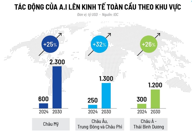 Tuy nhiên, giữa bức tranh đầu tư sôi động và thực tế vĩ mô lại tồn tại một độ vênh đáng chú ý. Tại Mỹ và Liên minh châu Âu (EU), năng suất lao động tăng chậm, GDP chưa cho thấy bước nhảy đột biến tương xứng với quy mô đầu tư. Thu nhập thực tế của người lao động cũng chưa phản ánh một cú hích công nghệ mang tính hệ thống, trong khi lạm phát có xu hướng tăng cao.