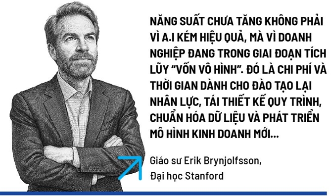 Giải thích cho độ trễ này, Giáo sư Kinh tế Erik Brynjolfsson từ Đại học Stanford từng cho rằng năng suất chưa tăng không phải vì A.I kém hiệu quả, mà vì doanh nghiệp đang trong giai đoạn tích lũy “vốn vô hình”. Đó là chi phí và thời gian dành cho đào tạo lại nhân lực, tái thiết kế quy trình, chuẩn hóa dữ liệu và phát triển mô hình kinh doanh mới. Những khoản đầu tư này chưa thể phản ánh ngay vào GDP nhưng lại là điều kiện nền tảng cho tăng trưởng về sau. Nói cách khác, A.I có thể vẫn đang ở giai đoạn chuẩn bị cấu trúc hơn là giai đoạn bùng nổ đầu ra.