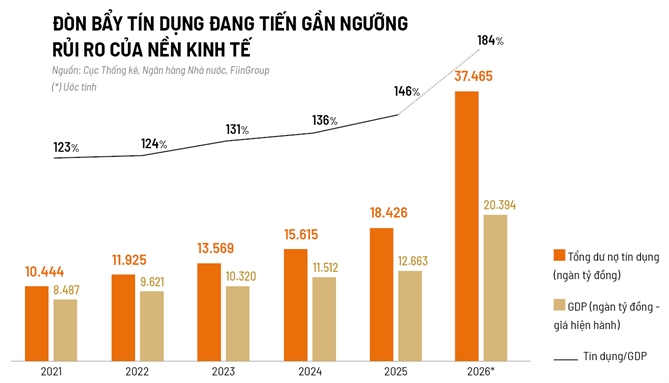 Dữ liệu từ FiinGroup cho thấy, mô hình tăng trưởng hiện vẫn phụ thuộc lớn vào tín dụng ngân hàng (tỷ lệ tín dụng/GDP đã ở mức cao khoảng 146% cuối năm 2025), trong khi dư địa mở rộng tín dụng bị giới hạn bởi rủi ro hệ thống và yêu cầu ổn định vĩ mô. Đầu tư công giữ vai trò dẫn dắt nhưng khó mở rộng mạnh về quy mô, còn FDI chủ yếu nâng năng lực sản xuất hơn là bổ sung thanh khoản tài chính.