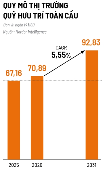 Quy mô thị trường quỹ hưu trí toàn cầu năm 2026 ước đạt 70.890 tỷ USD, phản ánh xu hướng dịch chuyển mạnh mẽ từ mô hình hưu trí công sang cấu trúc đa tầng (công cộng - doanh nghiệp - cá nhân).