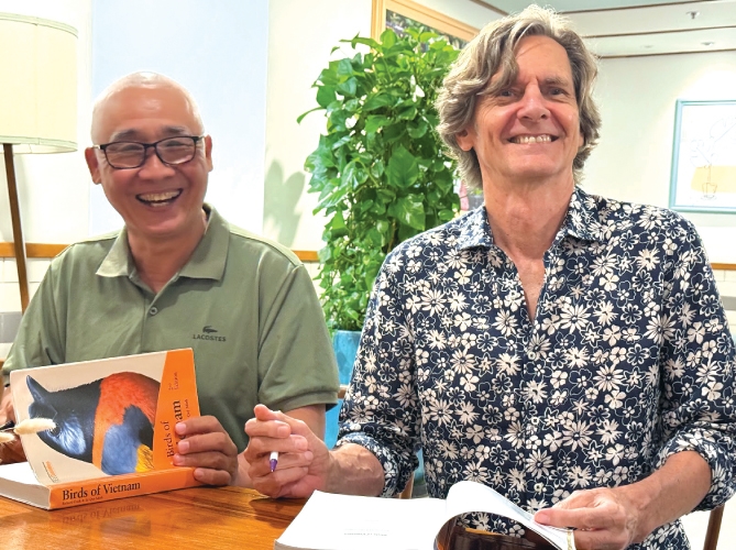 Cuộc gặp đầu tiên giữa hai người “trùng tên” diễn ra ít lâu sau, vào năm 1999, ở Vườn Quốc gia Bạch Mã. Khi đó, ông Minh làm lễ tân hướng dẫn, còn Richard đang làm trong lĩnh vực lữ hành và phối hợp cùng WWF để xây dựng bản đồ du lịch sinh thái cho các vườn quốc gia. Richard ghé Bạch Mã trong chuyến khảo sát và buổi chiều hôm đó họ đi xem chim lần đầu cùng nhau. Từ lần ấy, Richard và vợ quay lại Bạch Mã đều đặn mỗi năm 2 lượt, mỗi lần ở lại 3-4 ngày để theo chân ông Minh vào rừng. Rồi những chuyến đi vượt khỏi Bạch Mã đến các vùng lân cận miền Trung, sau đó là khắp cả nước, thậm chí cả nước ngoài. Cho đến hiện tại, thói quen của họ vẫn không đổi, dù tần suất có phần thưa hơn. “Thỉnh thoảng chúng tôi vẫn “trốn” vợ con, rong ruổi lên núi rừng theo vết các loài chim cả tuần liền”, ông Minh nói. “Tôi và Richard biết nhau đến nay cũng 27 năm rồi. Hai người khác quốc tịch mà vẫn giữ được mối liên lạc, vẫn làm việc mật thiết với nhau như vậy cũng là mối lương duyên. Giữa chúng tôi không có khái niệm sếp với nhân viên. Chỉ có tôn trọng, hiểu ý và hỗ trợ nhau. Cái gì chưa rõ thì hỏi, trao đổi thoải mái”, ông Minh nói. Tinh thần làm việc tôn trọng và tin cậy ấy được giữ nguyên khi họ cùng thực hiện Birds of Vietnam (2018), cuốn cẩm nang thực địa đầu tiên dành riêng cho các loài chim Việt Nam. Đến năm 2024, ấn bản cập nhật tiếp tục ra mắt. “Cả tôi và Richard đều không học sinh học, cũng không phải nhà văn đặt bút xuống là viết ra được ngay”, ông Minh cho biết. Nhưng nhờ gần 2 thập kỷ tích lũy kinh nghiệm ngoài thực địa, khả năng ghi nhận tập tính loài, vùng phân bố và việc cập nhật dữ liệu khoa học từ nhiều nguồn, họ đã xây dựng được một cơ sở dữ liệu đủ chắc để đưa vào sách. “Ngày cầm được ấn bản đầu tiên trên tay, tôi thấy lòng lâng lâng, phấn khích và hãnh diện. Bình thường tôi chẳng bao giờ chia sẻ công việc lên Facebook, vậy mà hôm đó thấy trang bìa là chụp và đăng ngay”, ông Minh nhớ lại. Ông tự hào vì cuốn sách không phục vụ mục đích thương mại, mà để truyền cảm hứng cho những người yêu chim và giúp mọi người tiếp cận dữ liệu một cách dễ dàng hơn. Birds of Vietnam cũng là kết tinh của nhiều năm thực địa, của vô số chuyến đi và của tình bạn nghề hiếm có giữa ông Lê Quý Minh và Richard Craik. “Trải nghiệm này là một giá trị tinh thần không thể định giá được, mang lại sự thỏa mãn hơn bất kỳ mục đích kinh tế nào khác”, ông Minh nói. |