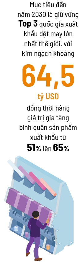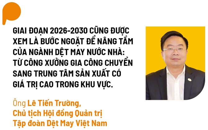 Theo ông Lê Tiến Trường, Chủ tịch Hội đồng Quản trị Tập đoàn Dệt May Việt Nam, nếu đặt mục tiêu tăng 10%/năm liên tục trong 5 năm, quy mô ngành phải đạt khoảng 75 tỷ USD vào năm 2030, con số này không phù hợp với tổng cầu thị trường cũng như khả năng cung ứng lao động hiện nay. Vì vậy, con đường khả thi không nằm ở việc mở rộng quy mô sản xuất hay gia tăng số lượng đơn hàng, mà ở tăng trưởng theo chiều sâu, thông qua nâng cao giá trị gia tăng, năng suất lao động, chủ động nguyên phụ liệu và vị thế của doanh nghiệp Việt trong chuỗi giá trị toàn cầu.