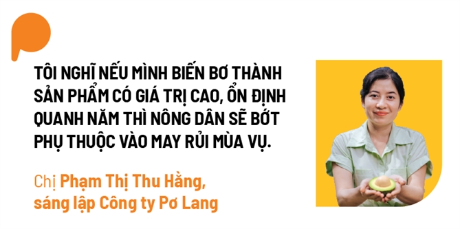 Khi còn là giáo viên sinh học tại một trường làng ở Đắk Lắk, chị Phạm Thị Thu Hằng, sáng lập Công ty Trách nhiệm Hữu hạn Sản xuất và Thương mại Pơ Lang, nhiều lần chứng kiến cảnh bơ sai trĩu cành, quả to đẹp nhưng không có đầu ra ổn định. Thương lái thưa vắng, giá thu mua giảm sâu, thậm chí có mùa bơ phải bỏ lại trên vườn vì không ai đến mua. “Tôi nghĩ nếu mình biến bơ thành sản phẩm có giá trị cao, ổn định quanh năm thì người nông dân sẽ bớt phụ thuộc vào may rủi mùa vụ”, chị chia sẻ.