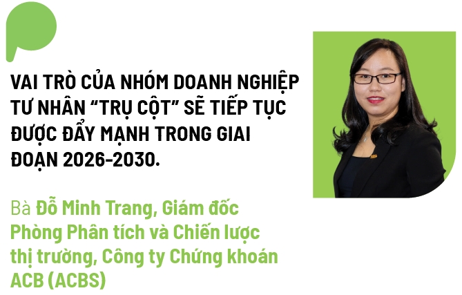 Chuyên gia của ACBS cho rằng vai trò của nhóm doanh nghiệp tư nhân “trụ cột” sẽ tiếp tục được đẩy mạnh trong giai đoạn 2026-2030. Năm 2025 ghi nhận sự thay đổi trong cơ chế dẫn đến sự mở rộng ngành nghề trong hoạt động kinh doanh của các doanh nghiệp đầu ngành, tiêu biểu như Vingroup. Bên cạnh đó, tầm nhìn “chấp nhận rủi ro” trong hoạt động phát triển khoa học công nghệ cũng sẽ là một điểm sáng trong việc phát triển các lĩnh vực công nghệ cao hướng đến nền tảng kinh tế số và kinh tế trên chuỗi khối (On-chain Economy).