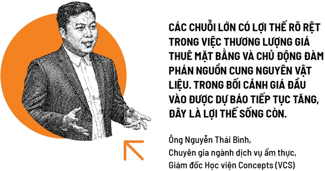 Ông Nguyễn Thái Bình, chuyên gia ngành dịch vụ ẩm thực, Giám đốc Học viện Concepts (VCS), nhận định, trong bối cảnh mới, các chuỗi F&B lớn ít gặp khó khăn hơn và vẫn duy trì được tốc độ mở rộng. “Các chuỗi lớn có lợi thế rõ rệt trong việc thương lượng giá thuê mặt bằng và chủ động đàm phán nguồn cung nguyên vật liệu. Với việc giá đầu vào được dự báo tiếp tục tăng, đây là lợi thế sống còn”, ông Bình phân tích.