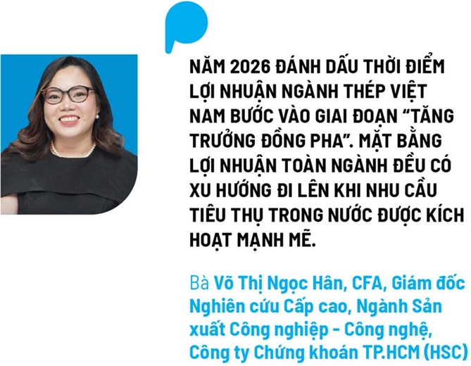 Theo bà Võ Thị Ngọc Hân, CFA, Giám đốc Nghiên cứu Cấp cao, Ngành Sản xuất Công nghiệp - Công nghệ, Công ty Chứng khoán TP.HCM (HSC), năm 2026 đánh dấu thời điểm lợi nhuận ngành thép Việt Nam bước vào giai đoạn “tăng trưởng đồng pha”. Mặt bằng lợi nhuận toàn ngành đều có xu hướng đi lên khi nhu cầu tiêu thụ trong nước được kích hoạt mạnh mẽ.