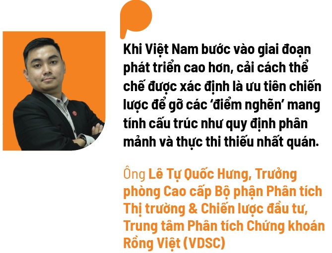 “Trong 5 - 10 năm tới, chúng tôi nhìn nhận triển vọng kinh tế Việt Nam theo hướng tích cực nhưng phụ thuộc chất lượng thực thi. Khi Việt Nam bước vào giai đoạn phát triển cao hơn, cải cách thể chế được xác định là ưu tiên chiến lược để gỡ các ‘điểm nghẽn’ mang tính cấu trúc như quy định phân mảnh và thực thi thiếu nhất quán”, ông Lê Tự Quốc Hưng, Trưởng phòng Cao cấp Bộ phận Phân tích Thị trường & Chiến lược đầu tư, Trung tâm Phân tích Chứng khoán Rồng Việt (VDSC) chia sẻ với NCĐT.