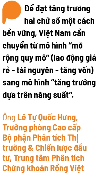Theo ông Hưng, để đạt tăng trưởng hai chữ số một cách bền vững, Việt Nam cần chuyển từ mô hình “mở rộng quy mô” (lao động giá rẻ - tài nguyên - tăng vốn) sang mô hình “tăng trưởng dựa trên năng suất” (TFP-led). Trọng tâm là đưa khoa học công nghệ và đổi mới sáng tạo thành động cơ cốt lõi, nâng chất lượng vốn, nâng kỹ năng lao động và làm chủ/ứng dụng nhanh các công nghệ then chốt (AI, dữ liệu, bán dẫn…), qua đó tạo ra biên tăng trưởng mới thay vì chỉ “đổ thêm đầu vào”.