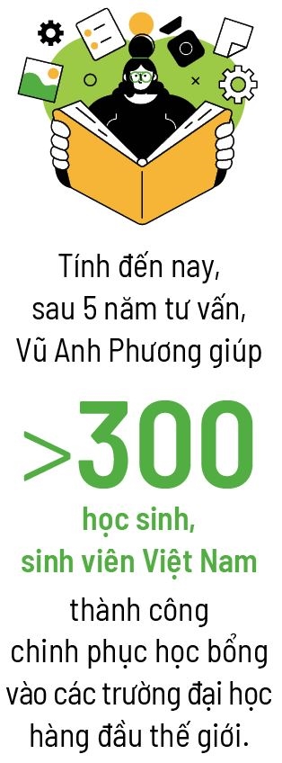 Ở thời điểm hiện tại, Anh Phương đang tổ chức tư vấn, kèm cặp trực tiếp cho các bạn học sinh, sinh viên có định hướng săn học bổng. Với thời gian dài ở Mỹ, Anh Phương có thể kết nối giáo sư, tiến sĩ để cùng hỗ trợ. Mỗi năm, cô chỉ kèm tối đa khoảng 10 bạn.