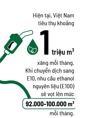 Ông Đỗ Văn Tuấn, Chủ tịch Hiệp hội Nhiên liệu sinh học Việt Nam, nhận định: “Khi chương trình nhiên liệu sinh học được tái khởi động với cách tiếp cận toàn diện hơn, đây là cơ hội để các nhà máy này hồi sinh và chạy hết công suất thiết kế”. Hiện tại, Việt Nam tiêu thụ khoảng 1 triệu m³ xăng mỗi tháng. Khi chuyển dịch sang E10, nhu cầu ethanol nguyên liệu (E100) sẽ vọt lên mức 92.000-100.000 m³ mỗi tháng. Con số này gấp gần 4 lần khả năng cung ứng hiện tại của các nhà máy trong nước (khoảng 25.000 m³/tháng). Sự thiếu hụt này, dù là thách thức, nhưng lại là thỏi nam châm thu hút các nhà đầu tư quay trở lại đường đua.