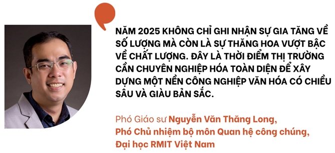 Phó Giáo sư Nguyễn Văn Thăng Long, Phó Chủ nhiệm bộ môn Quan hệ công chúng, Đại học RMIT Việt Nam, nhận định rằng năm 2025 không chỉ ghi nhận sự gia tăng về số lượng mà còn là sự thăng hoa vượt bậc về chất lượng. Theo ông, đây là thời điểm thị trường cần chuyên nghiệp hóa toàn diện để xây dựng một nền công nghiệp văn hóa có chiều sâu và giàu bản sắc.