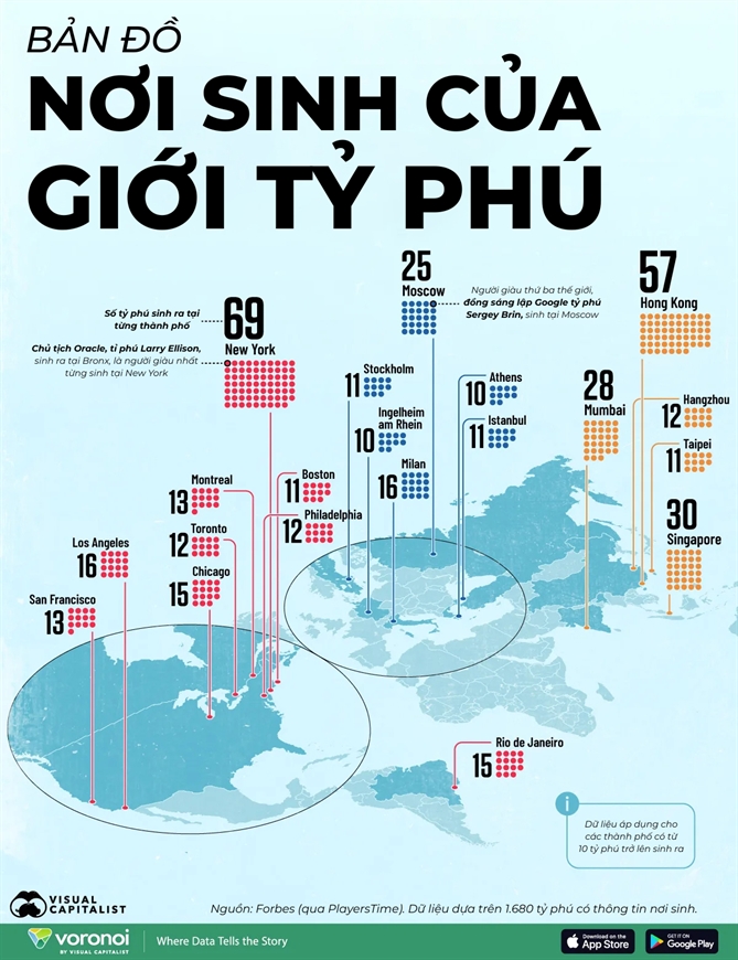 Bản đồ này cho thấy những thành phố trên thế giới có ít nhất 10 tỷ phú sinh ra, dựa trên phân tích năm 2026 của PlayersTime từ danh sách tỷ phú thời gian thực của Forbes. Dữ liệu bao gồm 1.680 tỷ phú, phản ánh những xu hướng đáng chú ý về sự phân bố địa lý theo khu vực và châu lục.