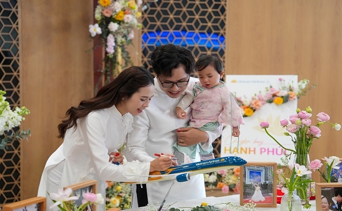 Các cặp đôi đã cùng ký tặng lên mô hình máy bay đặc biệt Vietnam Airlines như một các cách lưu giữ dấu ấn chung của “Chuyến bay Hạnh phúc”, nơi hạnh phúc của mỗi người được hòa vào niềm hạnh phúc chung của tất cả. |