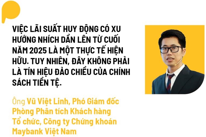 Ông Vũ Việt Linh, Phó Giám đốc Phòng Phân tích Khách hàng Tổ chức, Công ty Chứng khoán Maybank Việt Nam, lại đưa ra một hệ quy chiếu lạc quan hơn khi so sánh với lịch sử. “Dù mặt bằng lãi suất hiện tại đã cao hơn khoảng 1-1,5% so với mức đáy của quý II/2025, nhưng nếu đặt trong hệ quy chiếu lịch sử, đặc biệt là giai đoạn trước dịch COVID-19, mức lãi suất này vẫn đang ở vùng hợp lý và tương đối rẻ”, ông Linh chia sẻ với NCĐT. Ông cho rằng việc lãi suất huy động có xu hướng nhích dần lên từ cuối năm 2025 là một thực tế hiện hữu. Tuy nhiên, đây không phải là tín hiệu đảo chiều của chính sách tiền tệ.