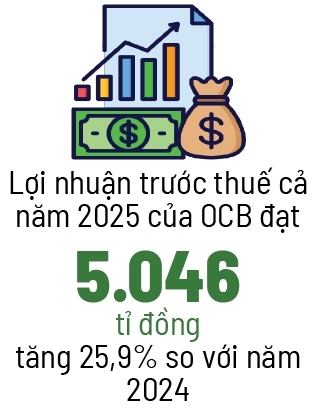 Tính riêng quý IV/2025, lợi nhuận trước thuế đạt 1.615 tỉ đồng, tăng 11,2% so với cùng kỳ năm trước. Nhờ đó, lợi nhuận trước thuế cả năm 2025 của OCB ghi nhận mức 5.046 tỉ đồng, tăng 25,9% so với năm 2024 và hoàn thành 95% kế hoạch được ĐHĐCĐ phê duyệt đầu năm.