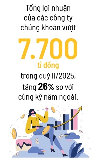 Thực tế, đà tăng trưởng của các công ty chứng khoán vẫn rất lạc quan. Tổng lợi nhuận của các công ty chứng khoán vượt 7.700 tỉ đồng trong quý II/2025, tăng 26% so với cùng kỳ năm ngoái và đánh dấu kỳ kinh doanh đạt mức lãi cao nhất từ trước đến nay.