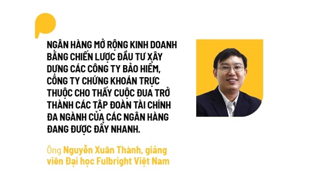 Việc ngân hàng phát triển hệ sinh thái tài chính là xu thế tất yếu trong việc xây dựng lợi thế cạnh tranh. Theo ông Nguyễn Xuân Thành, giảng viên Đại học Fulbright Việt Nam, ngân hàng mở rộng kinh doanh bằng chiến lược đầu tư xây dựng các công ty bảo hiểm, công ty chứng khoán trực thuộc cho thấy cuộc đua trở thành các tập đoàn tài chính đa ngành của các ngân hàng đang được đẩy nhanh.