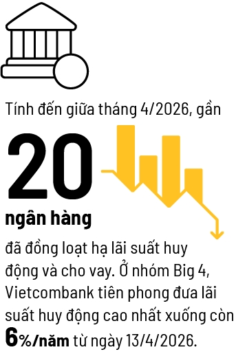 Tính đến giữa tháng 4/2026, gần 20 ngân hàng đã đồng loạt hạ lãi suất huy động và cho vay. Ở nhóm Big 4, Vietcombank tiên phong đưa lãi suất huy động cao nhất xuống còn 6%/năm từ ngày 13/4; Agribank hạ 0,5%/năm lãi suất huy động kỳ hạn từ 24 tháng trở lên. Ở khối ngân hàng cổ phần, Nam A Bank giảm lãi suất cho vay cá nhân lên tới 3%/năm so với trước đó; Sacombank giảm 0,5% ở nhiều kỳ hạn cho cả huy động và cho vay.