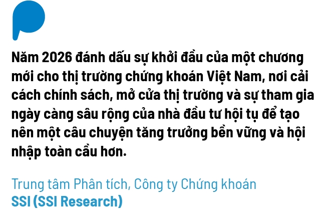 “Năm 2026 đánh dấu sự khởi đầu của một chương mới cho thị trường chứng khoán Việt Nam, nơi cải cách chính sách, mở cửa thị trường và sự tham gia ngày càng sâu rộng của nhà đầu tư hội tụ để tạo nên một câu chuyện tăng trưởng bền vững và hội nhập toàn cầu hơn. Thị trường không còn trong chế độ phục hồi, mà đang “bứt phá sau nâng hạng”, với chu kỳ tăng giá tiếp theo chỉ mới bắt đầu”, SSI Research nhận định.