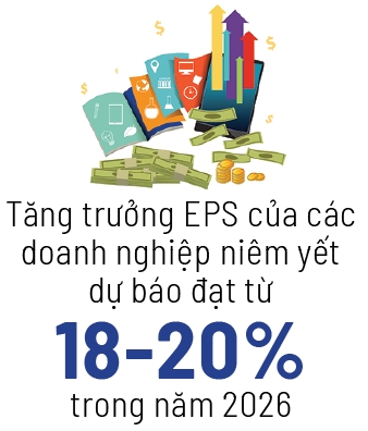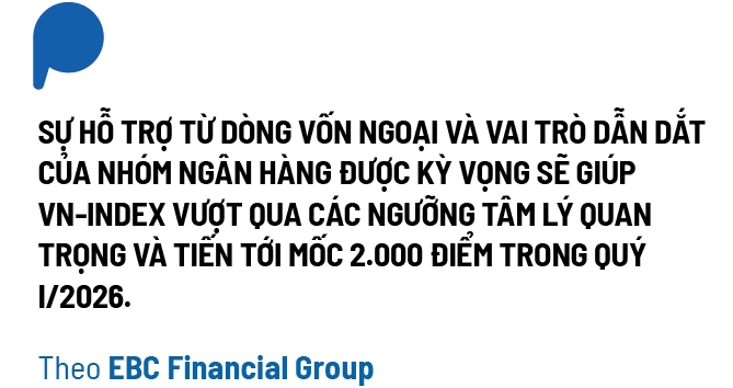 Dưới góc nhìn của EBC Financial Group, thị trường chứng khoán Việt Nam đang hội tụ đầy đủ các yếu tố “thiên thời, địa lợi, nhân hoà”. Tăng trưởng EPS (Earnings Per Share, chỉ số lợi nhuận trên mỗi cổ phiếu) dự báo đạt từ 18-20% trong năm 2026, cùng với định giá P/E vào khoảng 12,7x, mức hấp dẫn so với các thị trường trong khu vực như Thái Lan và Indonesia. Bên cạnh đó, sự hỗ trợ từ dòng vốn ngoại và vai trò dẫn dắt của nhóm ngân hàng được kỳ vọng sẽ giúp VN-Index vượt qua các ngưỡng tâm lý quan trọng và tiến tới mốc 2.000 điểm trong quý I/2026, nhiều khả năng rơi vào giai đoạn giữa tháng 2 đến đầu tháng 3.