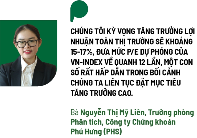 “Chúng tôi kỳ vọng tăng trưởng lợi nhuận toàn thị trường sẽ khoảng 15-17%. Điều này đưa mức P/E dự phóng của VN-Index về quanh 12 lần, một con số rất hấp dẫn trong bối cảnh chúng ta liên tục đặt mục tiêu tăng trưởng cao”, bà Liên chia sẻ.