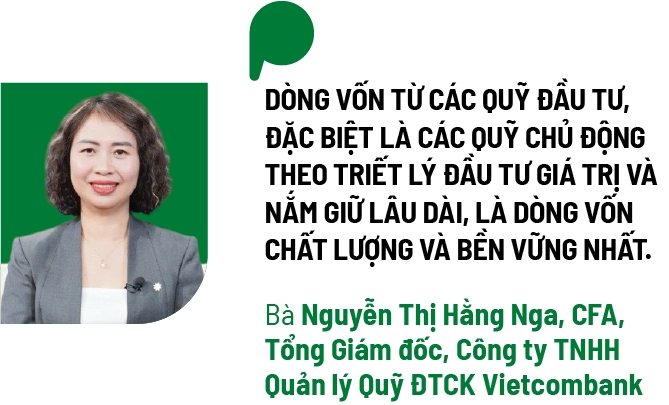 “Chúng tôi đánh giá dòng vốn từ các quỹ đầu tư, đặc biệt là các quỹ chủ động theo triết lý đầu tư giá trị và nắm giữ lâu dài, là dòng vốn chất lượng và bền vững nhất”, bà Nga chia sẻ.