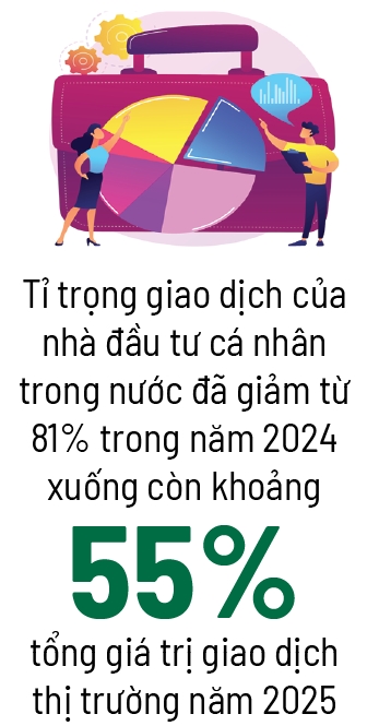Ngược lại, nhà đầu tư nước ngoài chiếm khoảng 9-10% giá trị giao dịch năm 2025. Trước đây dòng vốn ngoại thường dẫn dắt thị trường, nhưng những năm qua dòng tiền nội đã áp đảo nên không còn bị ảnh hưởng quá nhiều bởi khối ngoại như trước. Điểm bất ngờ là năm 2025, tỉ trọng giao dịch của nhà đầu tư tổ chức Việt Nam tăng lên 35%, chủ yếu đến từ khối tự doanh của các công ty chứng khoán và các quỹ ETF nội.