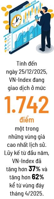 Theo quan sát của Tiến sĩ Trần Thăng Long, Giám đốc Phân tích Công ty Chứng khoán BIDV (BSC), 2025 là năm chỉ số tăng rất mạnh, nhưng mức tăng này chủ yếu đến từ khoảng 10 cổ phiếu dẫn dắt, gần như đóng góp phần lớn mức tăng điểm của thị trường. Trong khi đó, nhiều doanh nghiệp khác vẫn chưa ghi nhận mức tăng trưởng đáng kể về giá cổ phiếu.