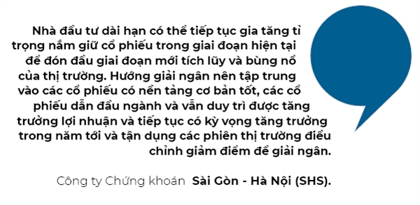 Với góc nhìn trung - dài hạn, công ty chứng khoán này cũng cho rằng thị trường đang tiến gần tới trạng thái thoát downtrend và cơ hội giải ngân đầu tư trung dài hạn xuất hiện ngày càng nhiều. Nhà đầu tư dài hạn hoàn toàn có thể tiếp tục gia tăng tỉ trọng nắm giữ cổ phiếu trong giai đoạn hiện tại để đón đầu giai đoạn mới tích lũy và bùng nổ của thị trường. Hướng giải ngân nên tập trung vào các cổ phiếu có nền tảng cơ bản tốt, các cổ phiếu dẫn đầu ngành, vẫn duy trì được tăng trưởng lợi nhuận, tiếp tục có kỳ vọng tăng trưởng trong năm tới và tận dụng các phiên thị trường điều chỉnh giảm điểm để giải ngân.