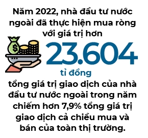 Sau chuỗi mua ròng mạnh mẽ trong những tháng cuối năm 2022, dòng tiền của khối ngoại tiếp tục trở thành điểm sáng trên thị trường chứng khoán Việt Nam. Phiên giao dịch 10/1, khối ngoại tiếp tục có một phiên mua ròng với 437,8 tỉ đồng trên sàn HOSE. Trong đó, cổ phiếu HPG là mã được mua ròng mạnh nhất, tới gần 105 tỉ đồng, các chứng chỉ quỹ như FUEVFVND, E1VFVN30 cũng được mua ròng mạnh trong phiên với 56 tỉ đồng và 39 tỉ đồng. Ngược lại, VCB dù là cổ phiếu trụ cột nhưng lại bị bán ròng mạnh nhất, giá trị gần 36 tỉ đồng.