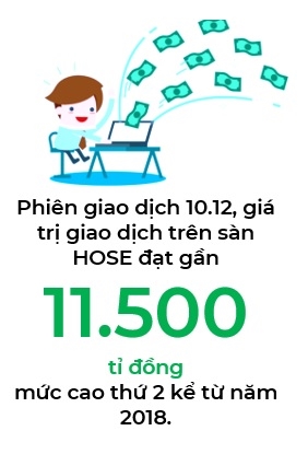 Thanh khoản thị trường phiên 10.12 lập kỷ lục mới với giá trị khớp lệnh sàn HOSE đạt gần 11.500 tỉ đồng, mức cao thứ 2 kể từ năm 2018.