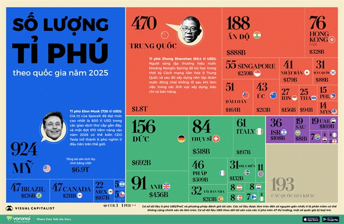 Trong bối cảnh tài sản ngày càng “phình to”, bản đồ tỉ phú theo quốc gia cũng tiếp tục thay đổi. Dù Mỹ và Trung Quốc vẫn thống trị về số lượng tuyệt đối, nhiều nền kinh tế nhỏ hơn lại chứng kiến tốc độ tăng trưởng tỉ phú nhanh hơn tính theo tỉ lệ phần trăm. Đồ họa dưới đây xếp hạng các quốc gia theo số lượng tỉ phú năm 2025, dữ liệu được lấy từ UBS.