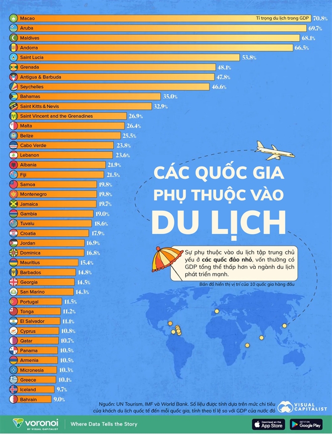 Với một số nước, du lịch chỉ là nguồn thu bổ sung, nhưng với những nước khác đây lại là trụ cột chính của toàn bộ nền kinh tế. Biểu đồ dưới đây xếp hạng các nền kinh tế theo tỉ trọng đóng góp của lĩnh vực du lịch vào GDP, dựa trên số liệu doanh thu từ chi tiêu của khách quốc tế tại mỗi nền kinh tế trong năm 2025 của UN Tourism và dữ liệu GDP của IMF.
