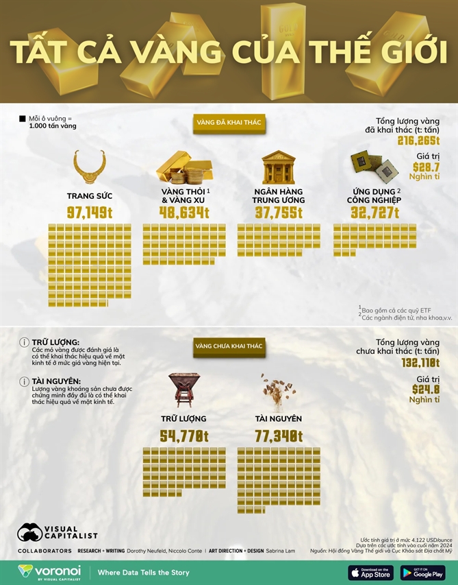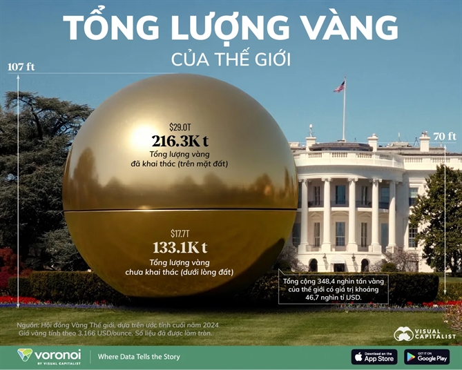 Đồ họa dưới đây mô tả tổng nguồn cung vàng của thế giới, bao gồm cả lượng vàng đã khai thác (trên mặt đất) và lượng vàng vẫn còn trong lòng đất, dựa trên số liệu của Hội đồng Vàng Thế giới. Tính đến cuối năm 2024, tổng lượng vàng đã được khai thác là 216.265 tấn. Với mức giá 4.166 USD/ounce, toàn bộ số vàng này tương đương giá trị khoảng 29 nghìn tỉ USD.