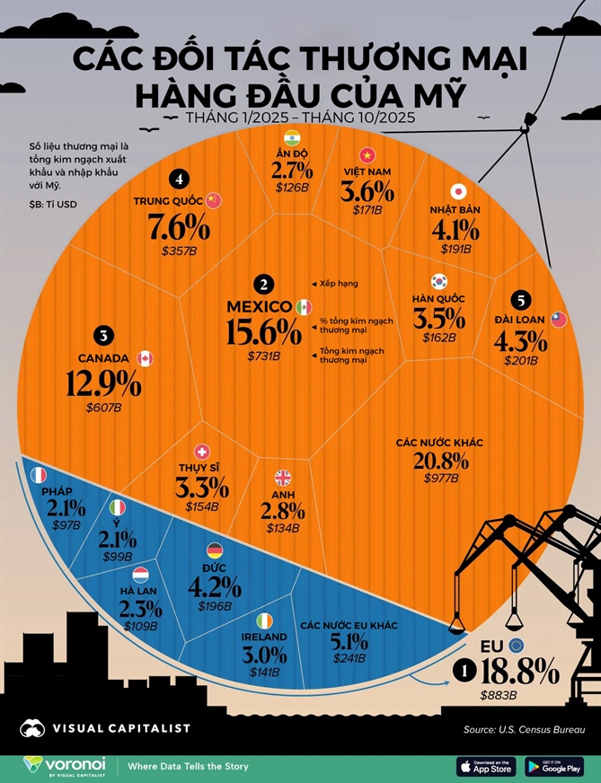 Đồ họa dưới đây cho thấy, các đối tác thương mại lớn nhất của Mỹ trong năm 2025 tính đến hết tháng 10, dựa trên dữ liệu của Cục Điều tra Dân số Mỹ (U.S. Census Bureau) thuộc Bộ Thương mại Mỹ.